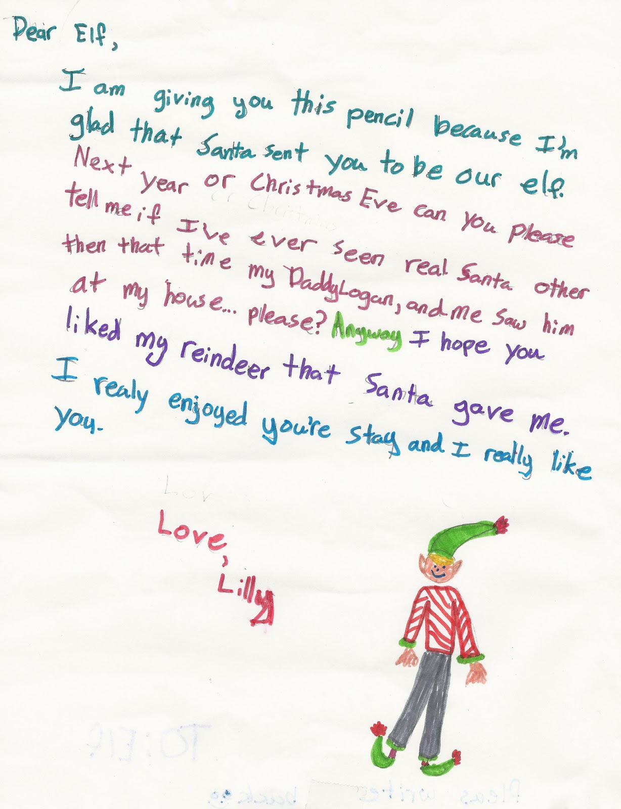 "I left a note for the Elf. AND I left my broken headband for him to fix. I can't wait to get home to see if he wrote me back and see if he fixed my headband!" (As a side note, if you aren't already familiar with the story of The Elf on the Shelf I strongly suggest you check it out.)